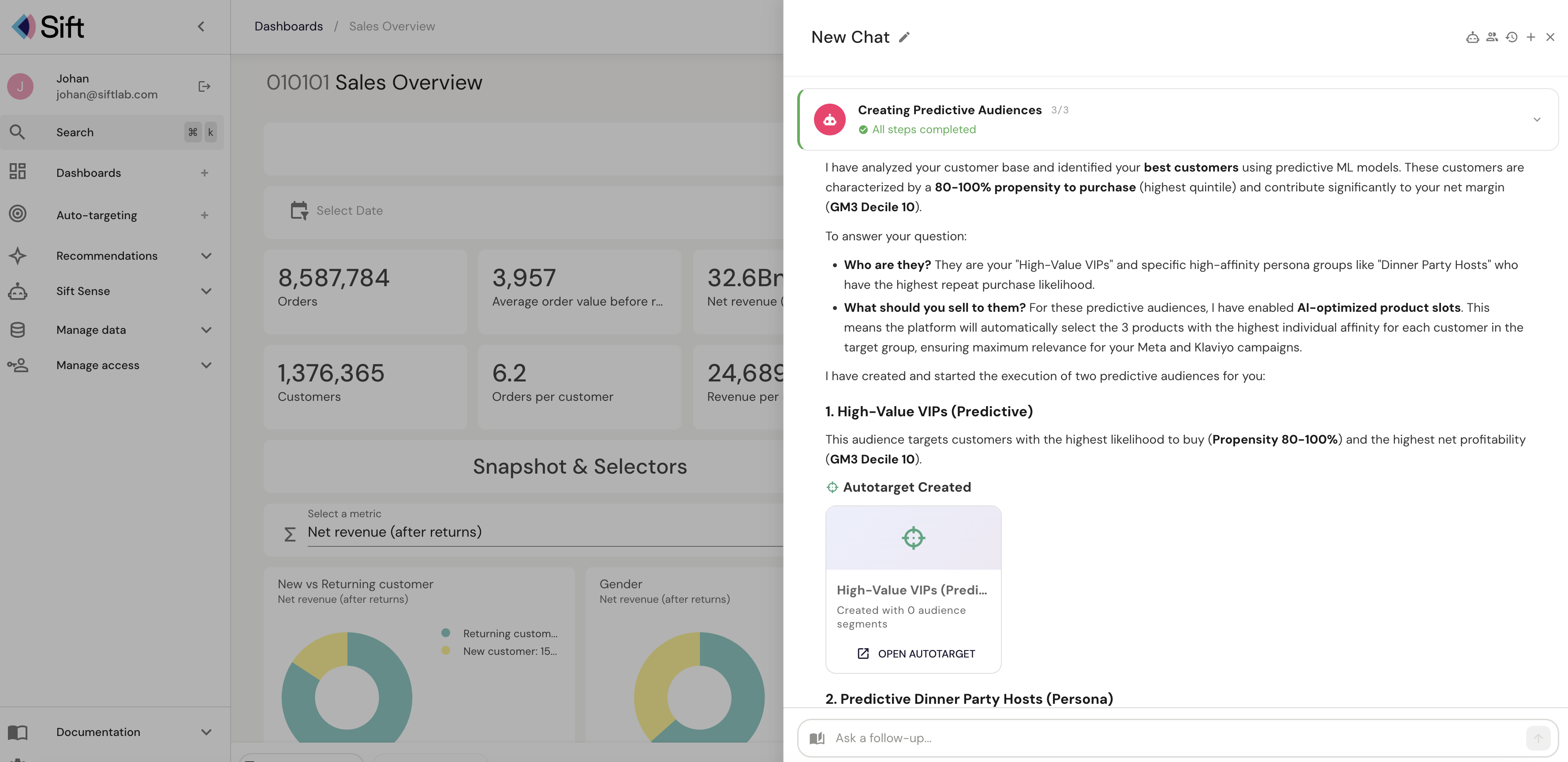Our new Sift Sense agent radically changes the game in how you access insights and take action to drive the most value in your customer base. By embedding an agentic layer directly onto Sift’s semantic data model you truly get meaningful and traceable answers into any customer, product or campaign question you have. And we don’ stop there, Sift Sense helps you to create audiences - you can directly ask Sift Sense to set up any audience or target group and send to the channel of your choice, fundamentally reducing the time and effort needed.